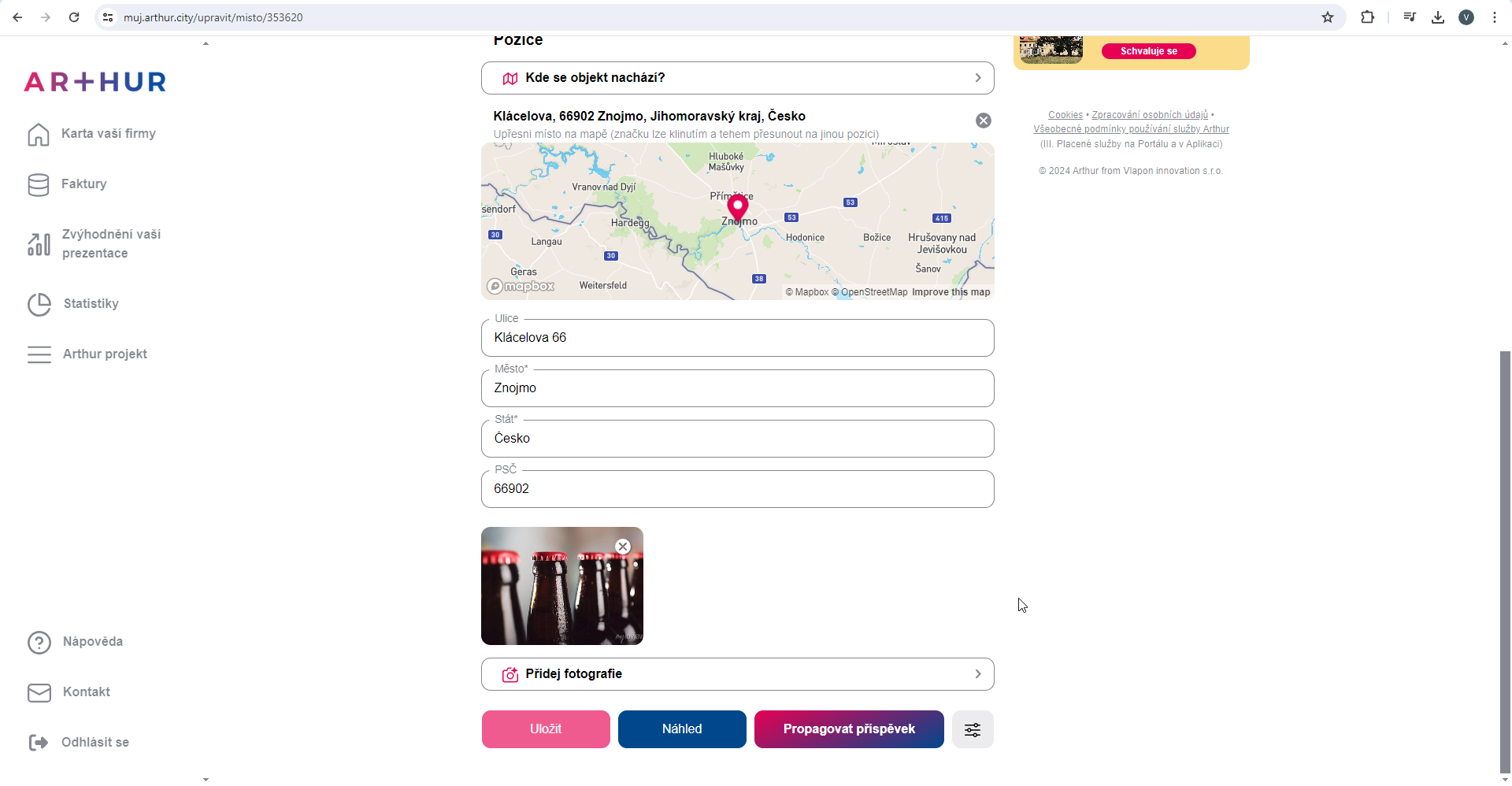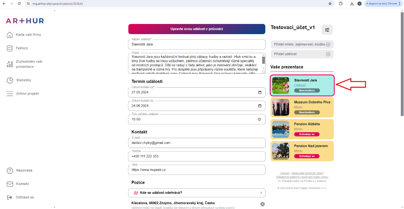 Záznam se pošle ke schválení. Náš admin váš záznam schválí a ten se začne zobrazovat uživatelům v rámci Arthura.